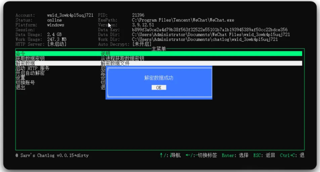 3. 完成迁移后,重新运行 chatlog 获取密钥并解密数据