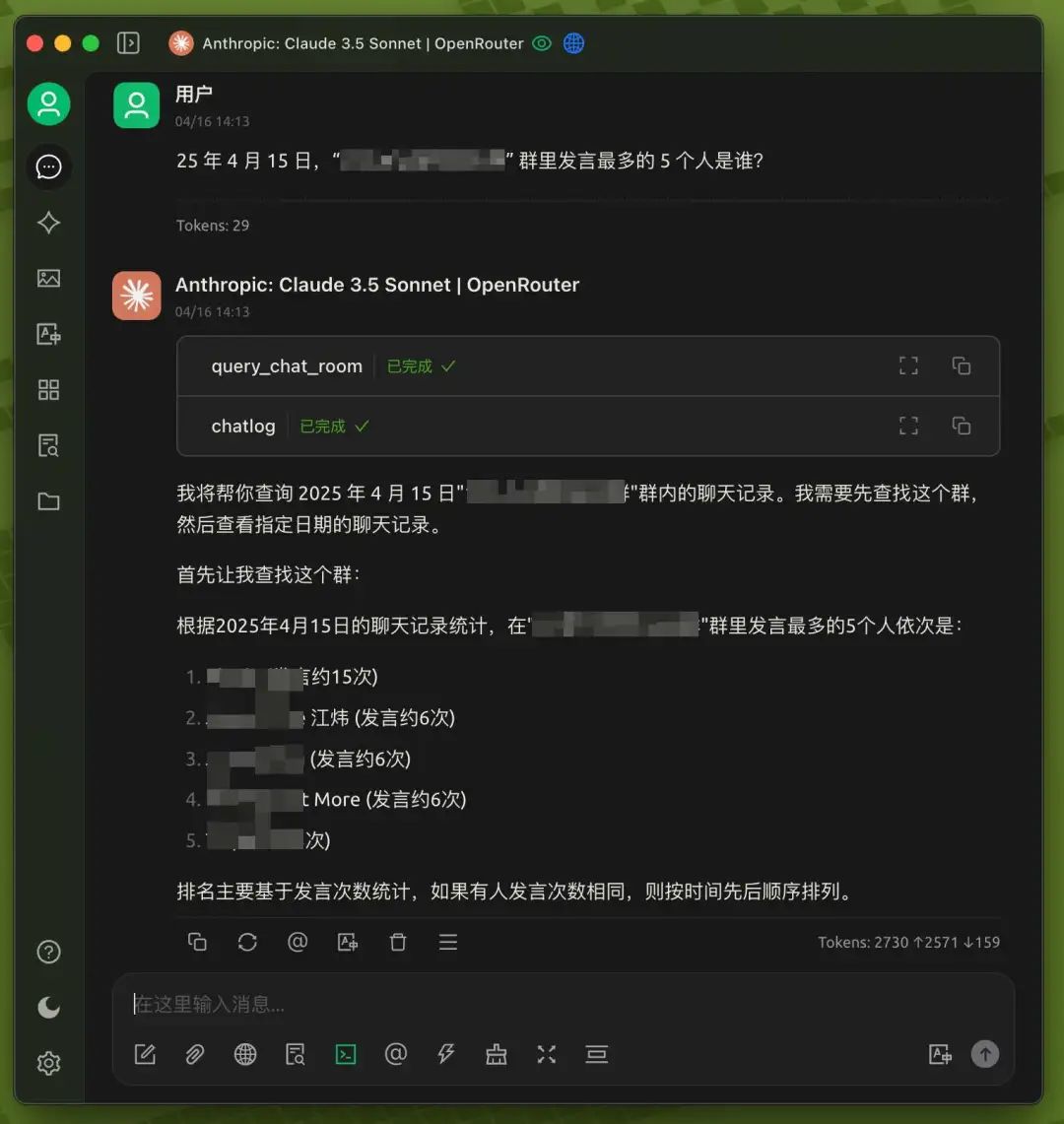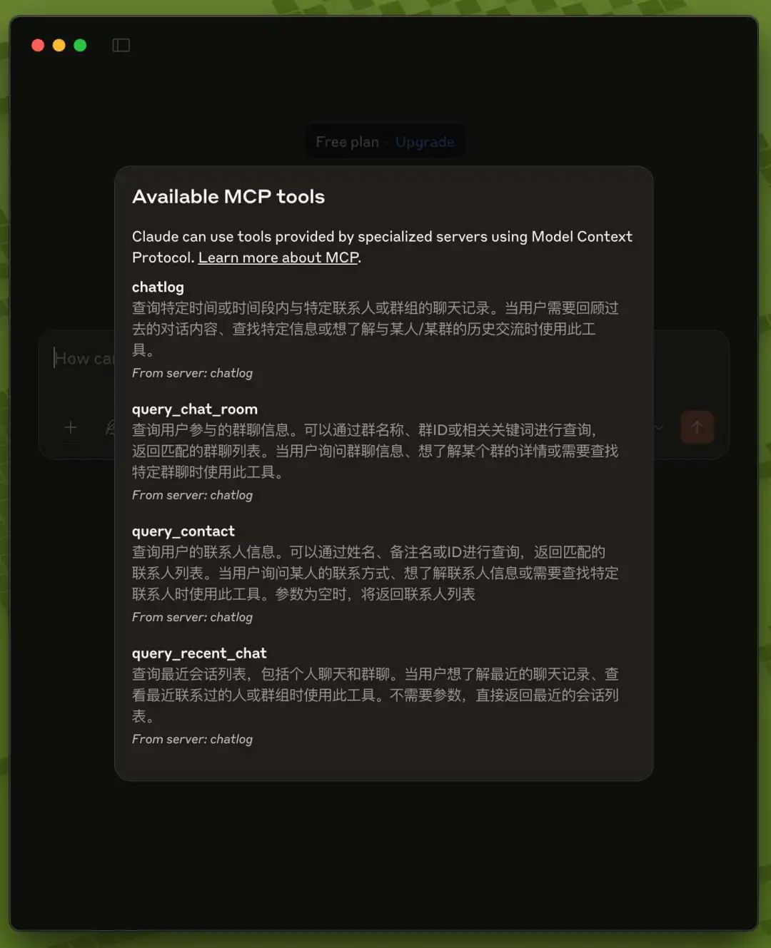 Chatlog 支持 MCP (Model Context Protocol) SSE 协议,可与支持 MCP 的 AI 助手无缝集成。