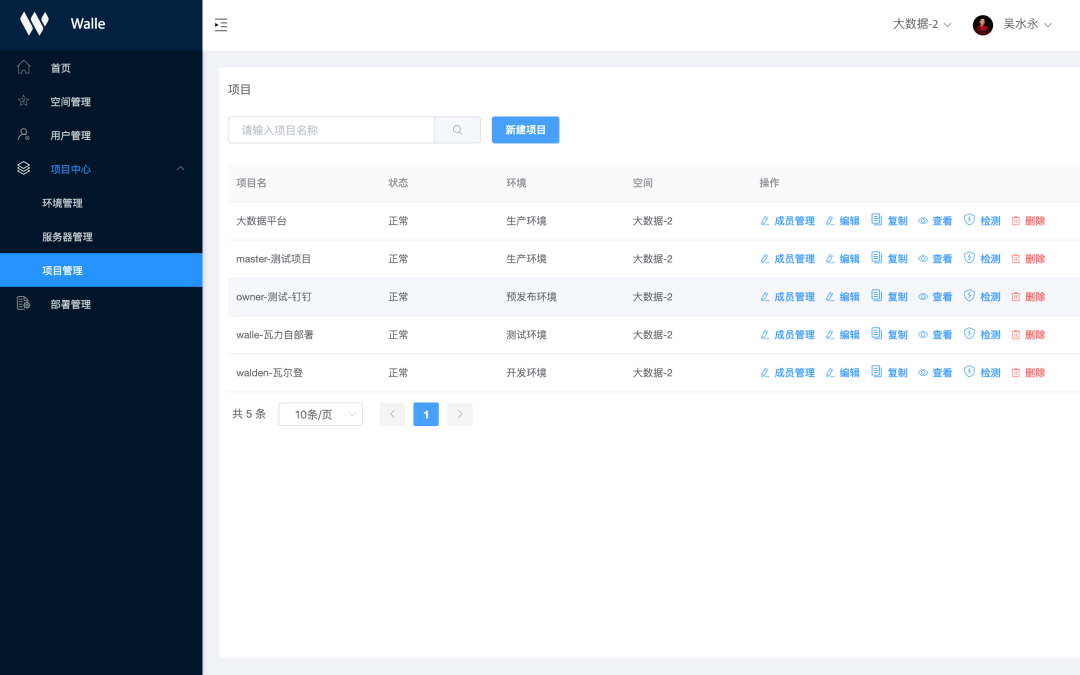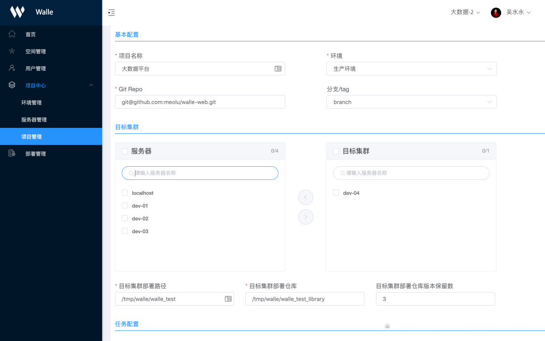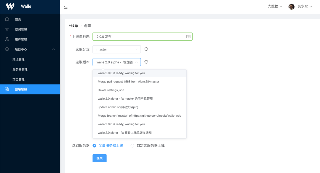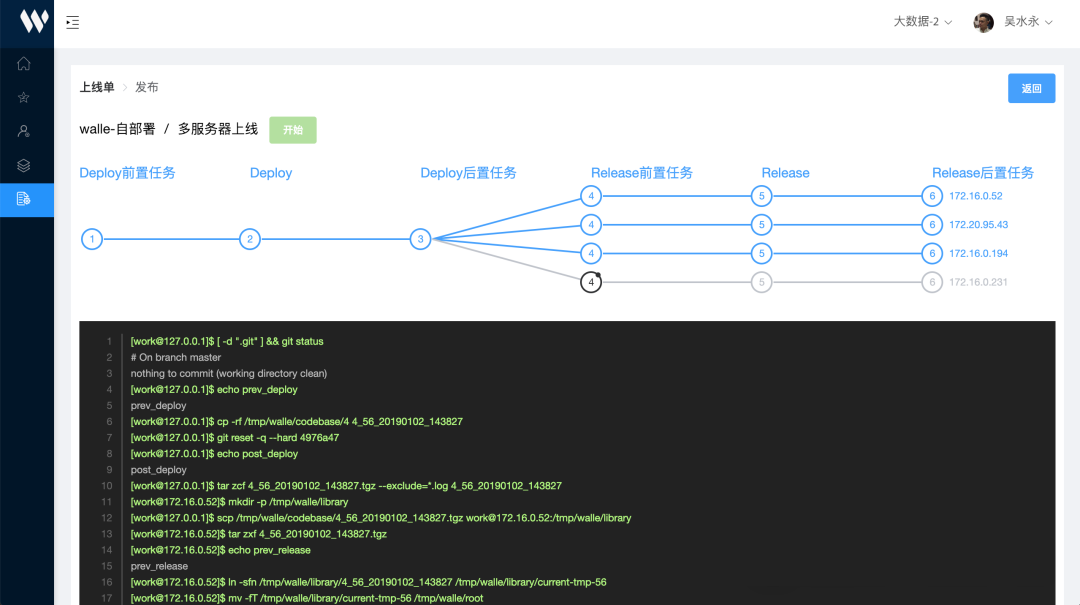 Walle是一款系统部署工具,配置简单、功能完善、界面流畅、开箱即用!支持git、svn版本管理,支持各种web代码发布,PHP,Python,JAVA等代码的发布、回滚,可以通过web来一键完成。