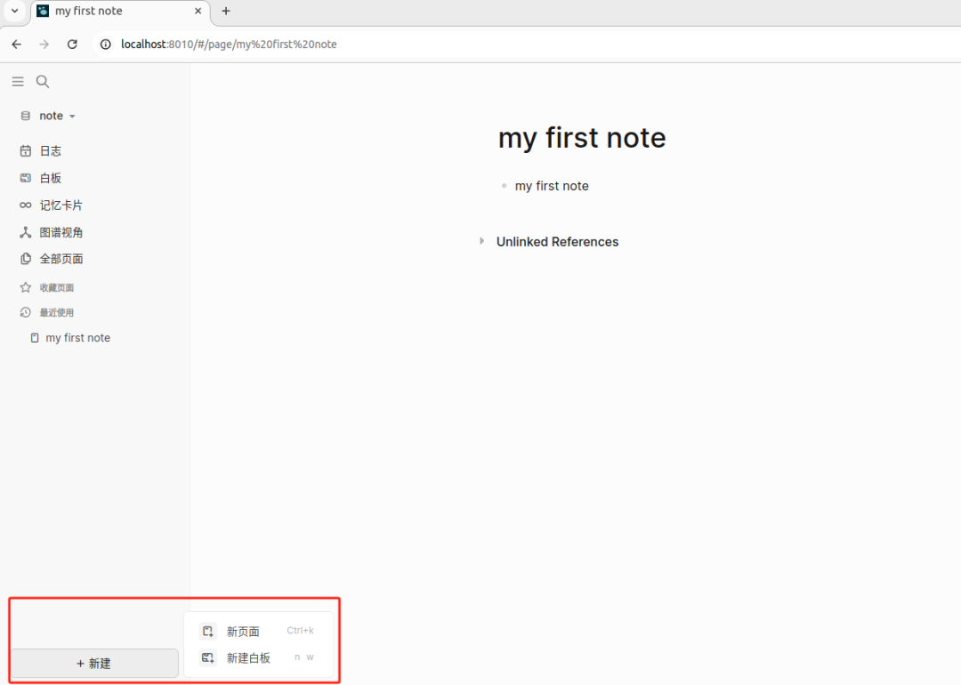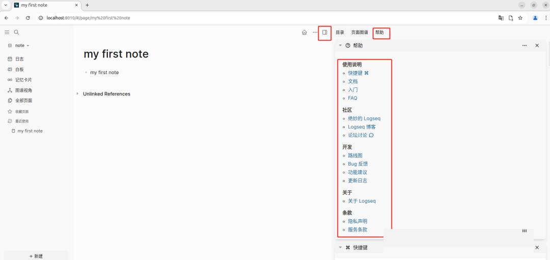 现在就已经部署完毕了,打开 Web 浏览器输入 localhost:8010,就可以访问到 Logseq 笔记的 web 页面了。