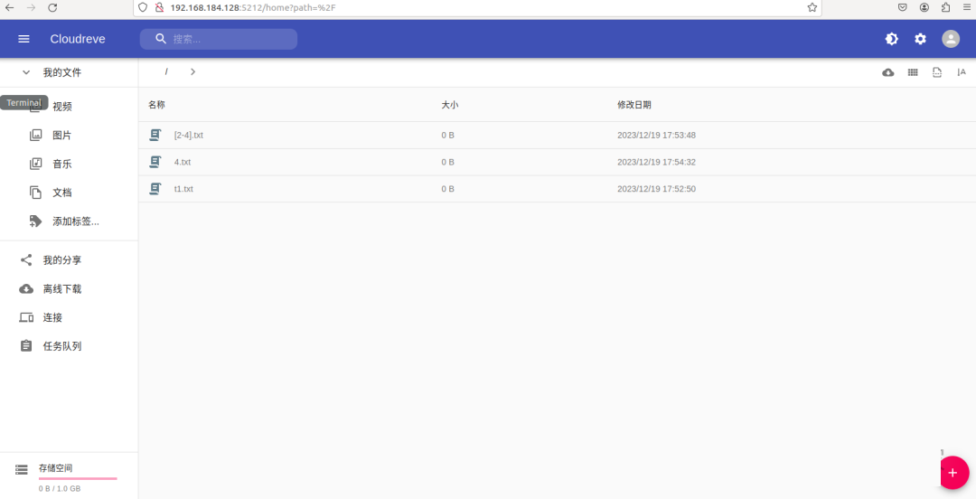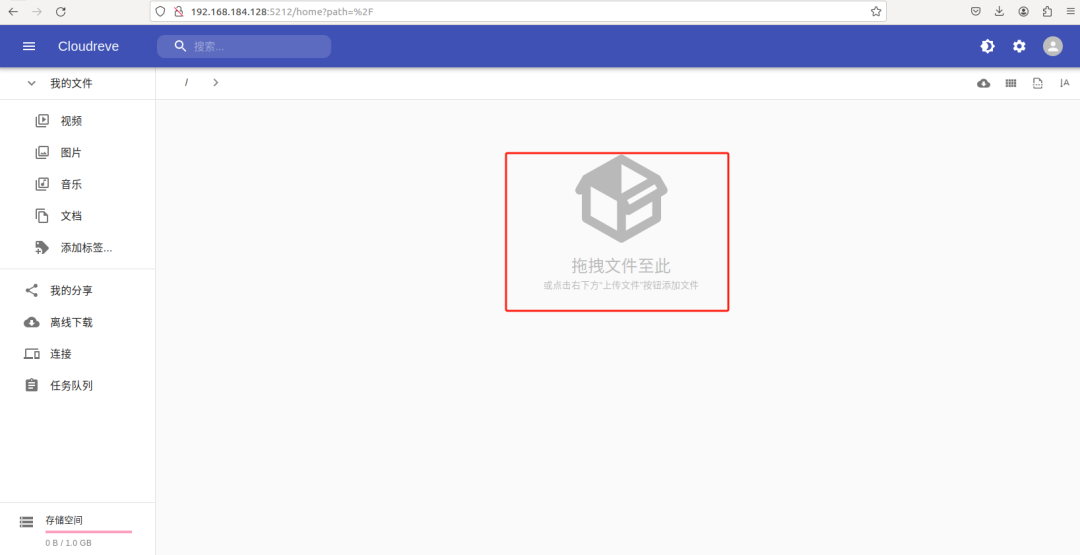通过拖拽文件或是点击红色添加按钮的方式上传本地文件到Cloudreve中