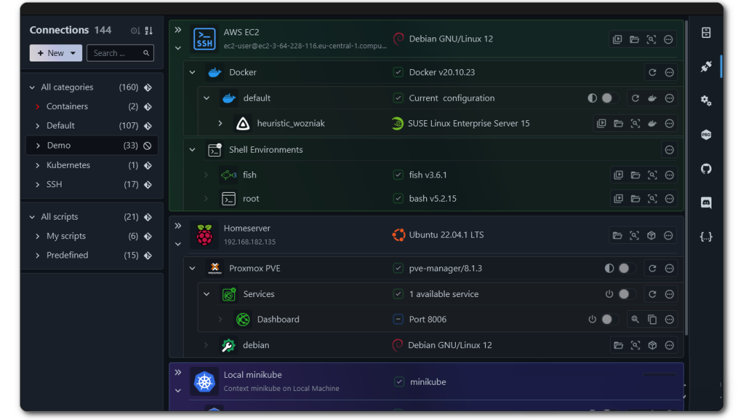多功能连接中心: 支持 SSH、Docker、Kubernetes、Proxmox、VMware 等多种连接类型,用户可以通过一个界面快速管理各种环境。 -