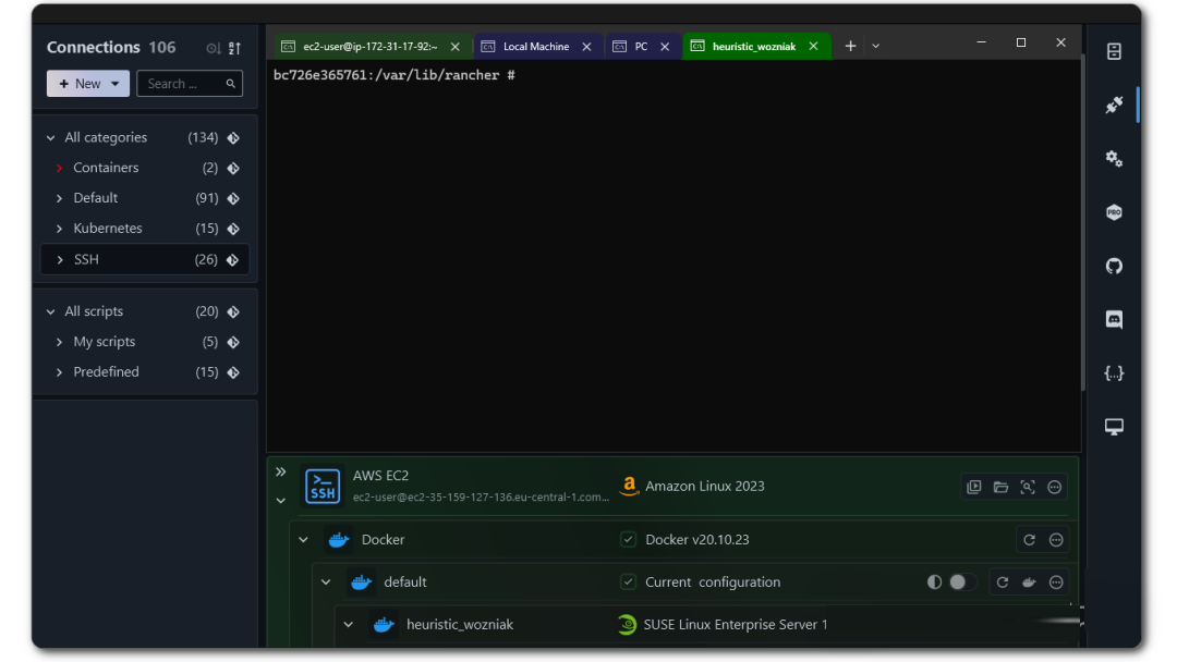 高效连接: 通过层级式分类整理,用户可以轻松管理上百个连接,并通过快捷操作(如容器的启动/停止、建立隧道等)显著提升效率。 -