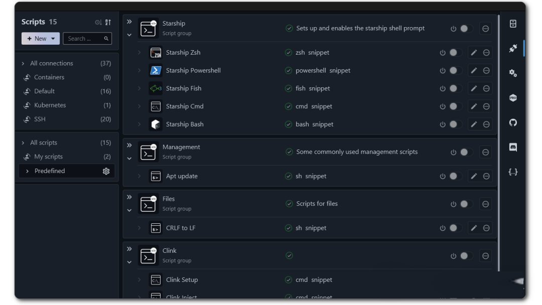 脚本系统: 支持创建可重用的 Shell 脚本和模板,自动同步至远程会话,实现自动化管理。 -