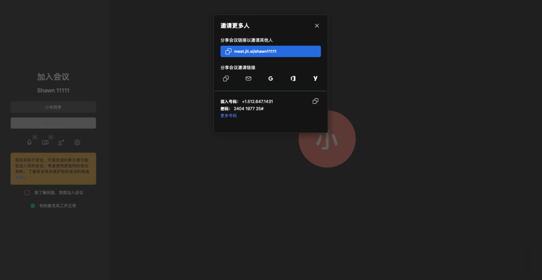 访问 meet.jit.si,输入会议名称即可创建会议。无需注册,支持 Google、Facebook 或 GitHub 账号登录。