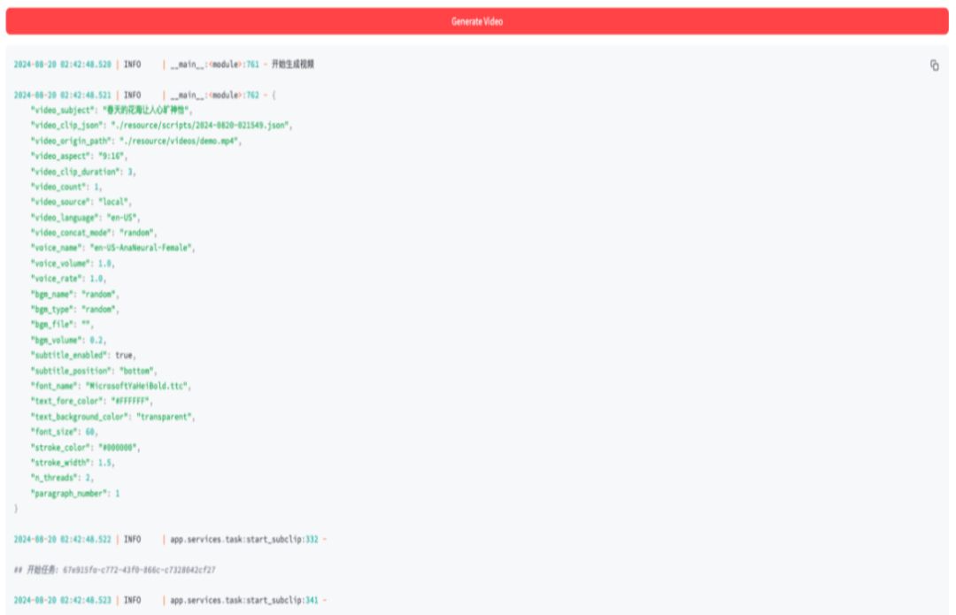 设置视频参数(如片段时长、分辨率),点击生成即可输出最终视频。