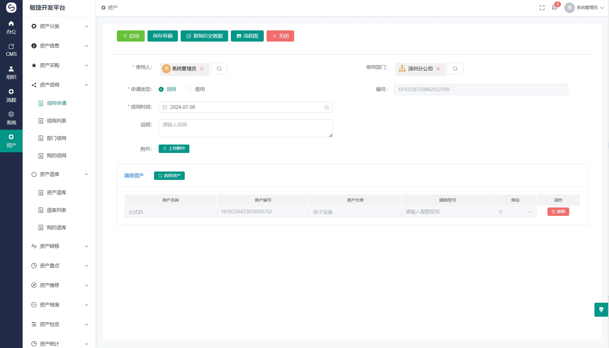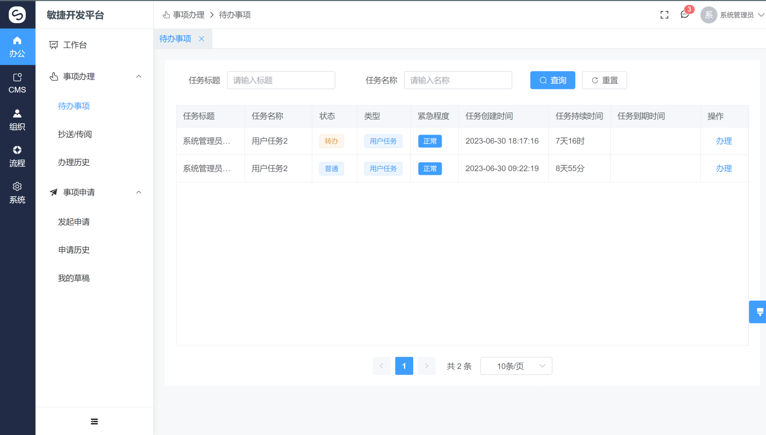 个人办公: 待办事项、抄送传阅、办理历史、发起申请、申请历史、我的草稿 -