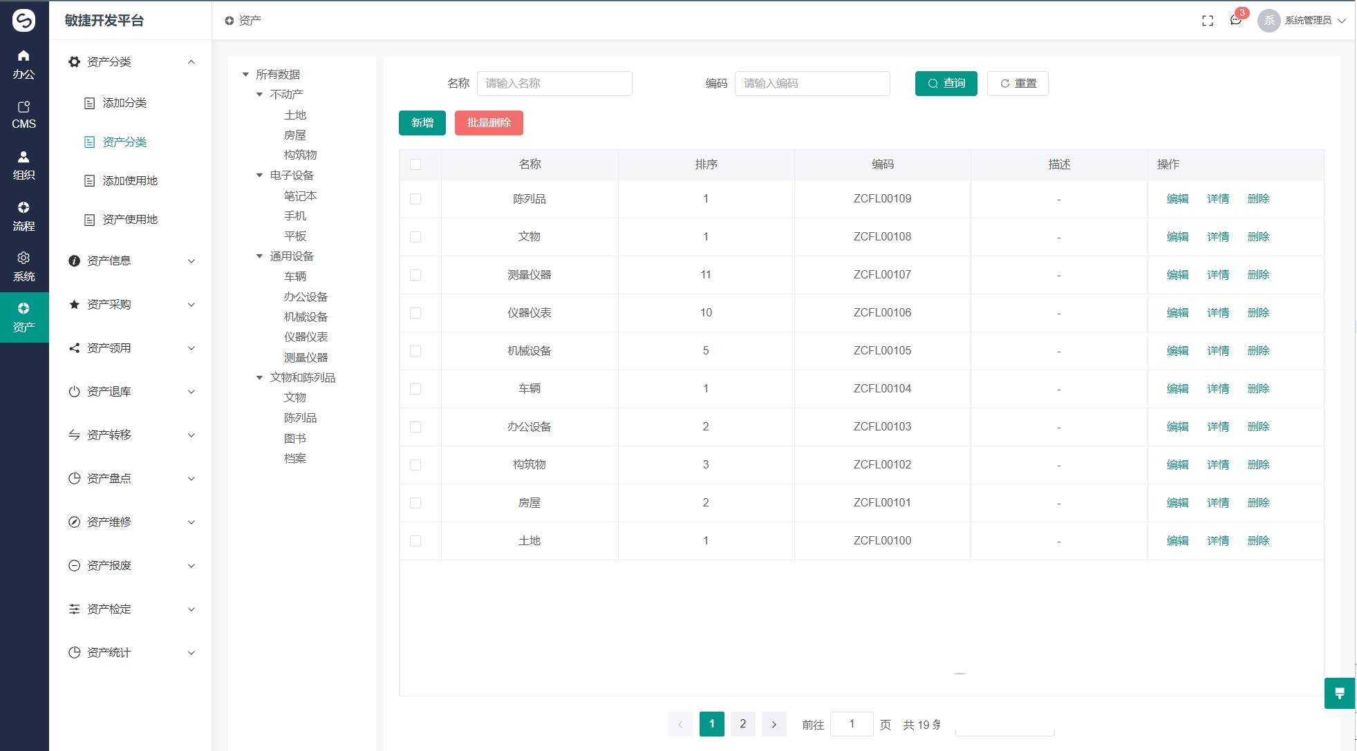 系统管理: 字典分类管理、异常日志、系统资源、系统属性、常用脚本、短信邮件通知 -