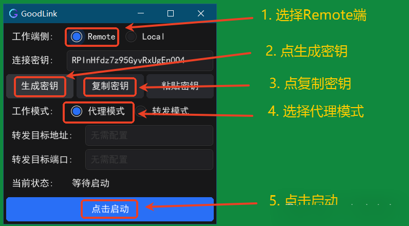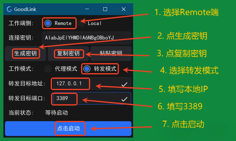 注: 转发模式仅支持TCP协议,一个remote端只能转发一个端口,可运行多个remote端