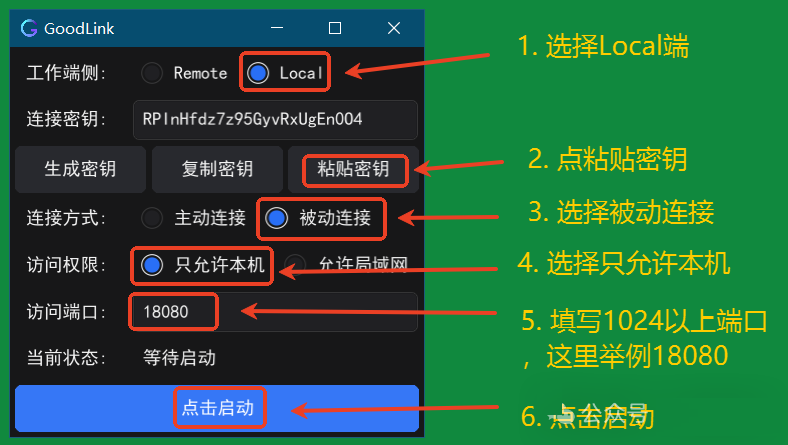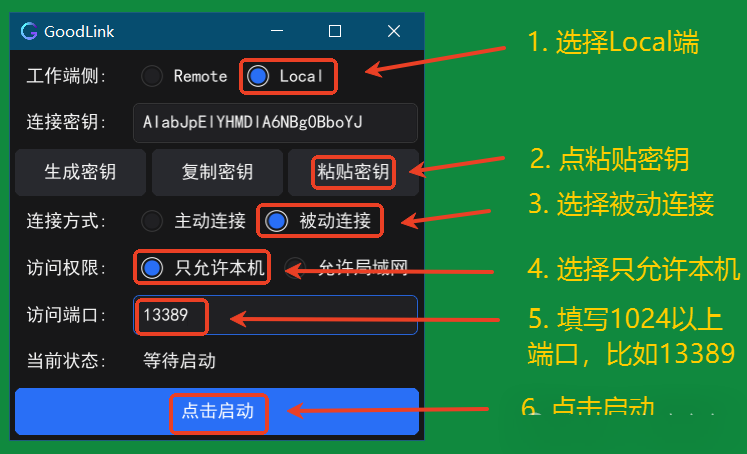 注: 当最下方的按钮变成绿色,表示连接成功。如果超过 10 分钟无法连接,按照下图先“点击关闭”,然后选择“主动连接”,再“点击启动”
