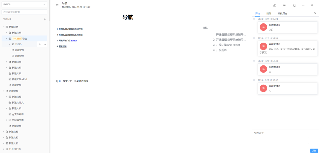 文档导入导出: 系统支持任意格式文件的导入,支持空间整体的导入、导出与复制,支持文档的跨空间复制与迁移。 -
