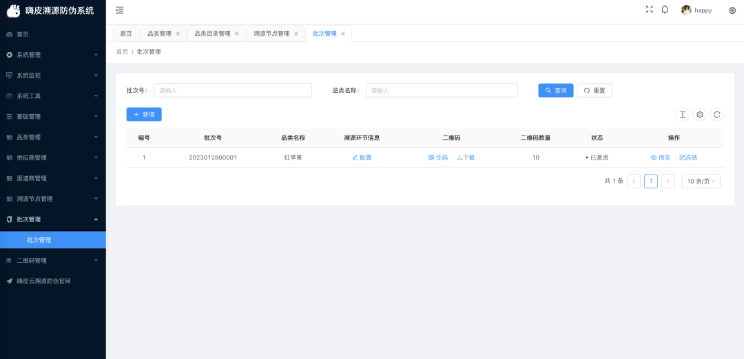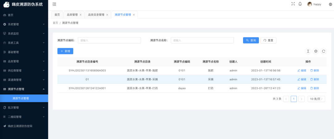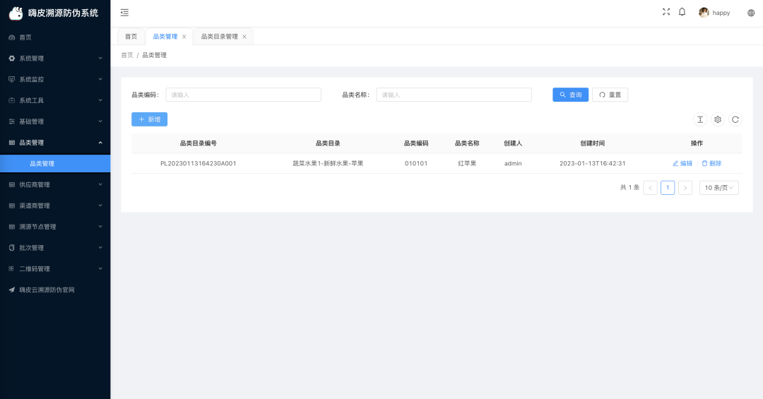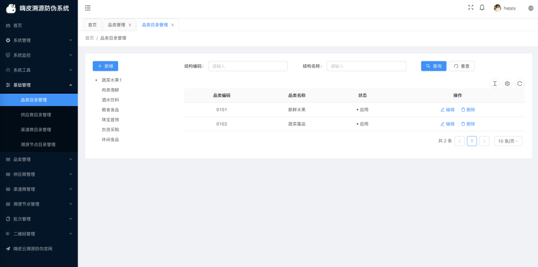 基础管理 : 品类目录管理、供应商目录管理、渠道商目录管理、溯源环节目录管理; -