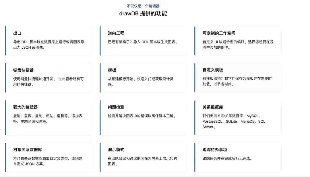 DrawDB允许用户以图形化的方式查看数据库表及其关系,帮助理解和优化数据库结构,提供多种视图模式,如ER图,以便于更好地理解数据结构。