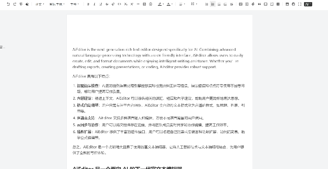 AIEditor 的目标是打造一个完全由 AI 驱动的富文本编辑器,同时支持对接任意大模型,包括私有的大模型。允许用户使用自己私有的大模型 ApiKey。不仅如此,AIEditor 其所有的 AI 功能,都允许用户自定义自己的 prompt,以及扩展的 AI 菜单。