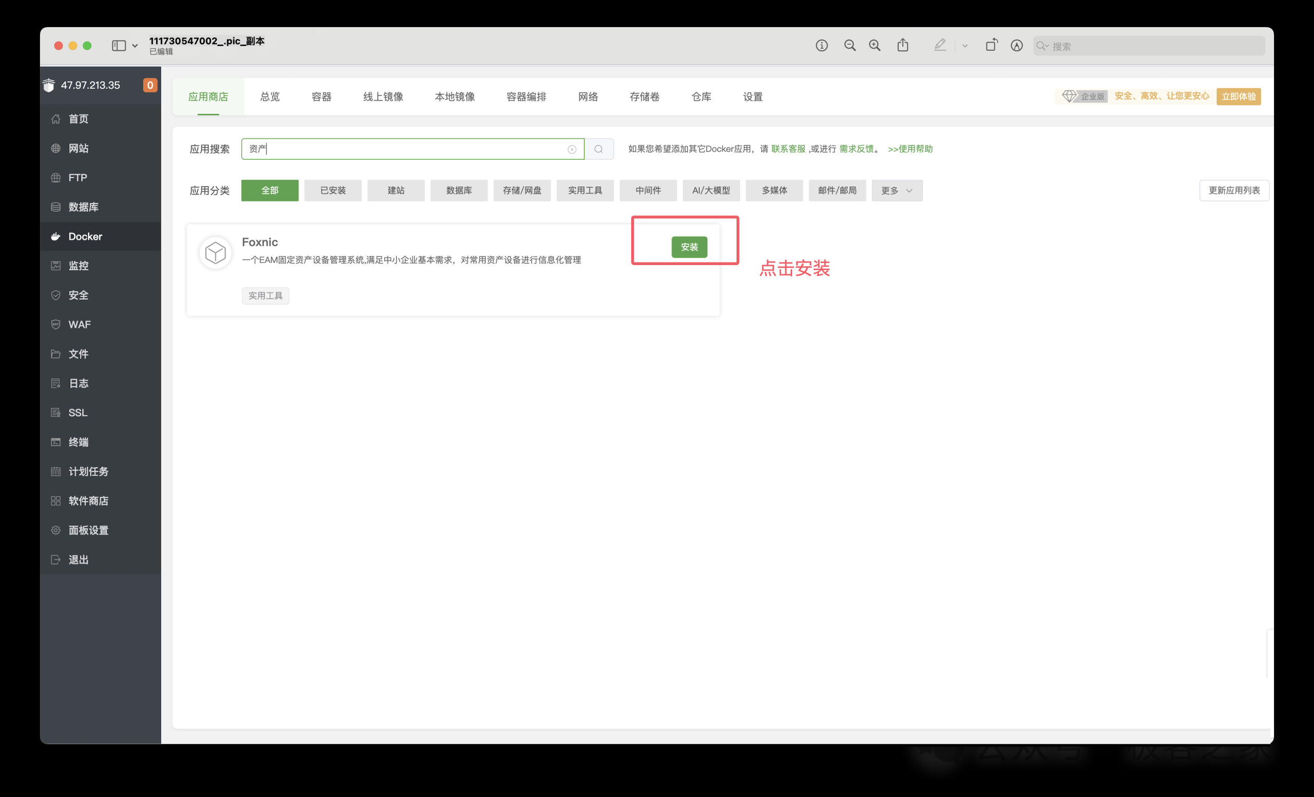 2、在Docker-应用商店,搜索foxnic或者资产