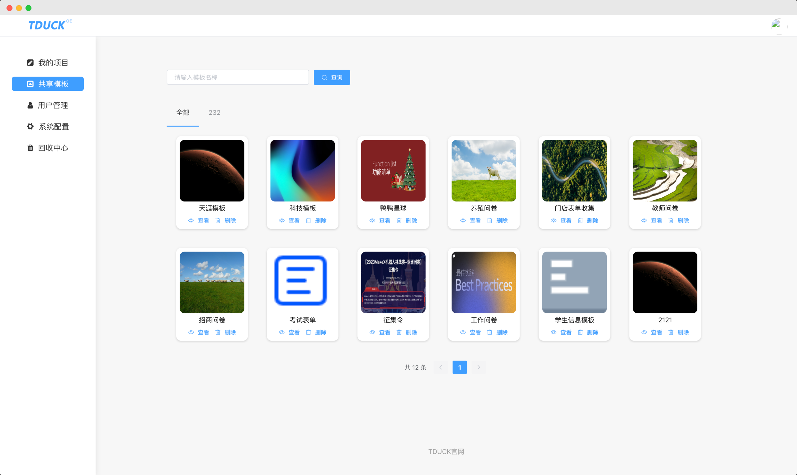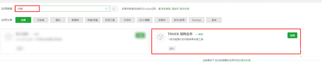 在宝塔面板>Docker菜单中搜索【填鸭表单】或【问卷】,找到tduck填鸭表单点击安装。