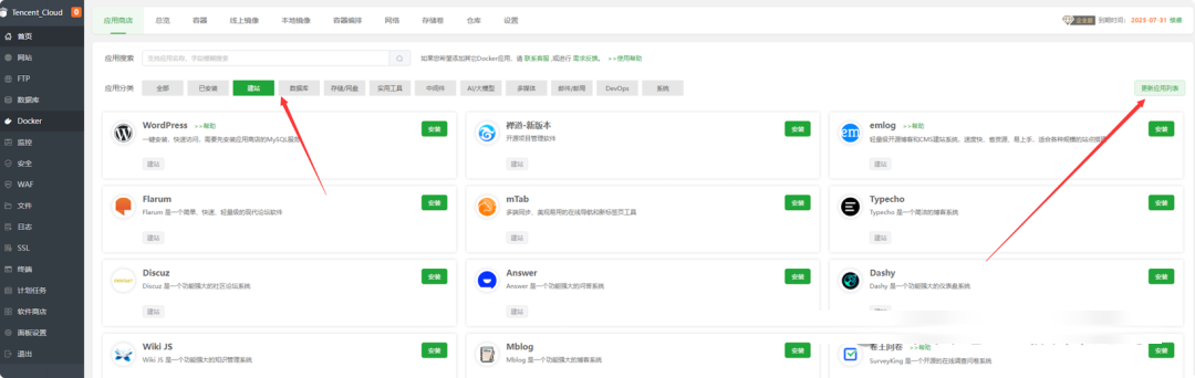 如果没有找到应用请先确认面板版本,并按下图进行更新软件列表。