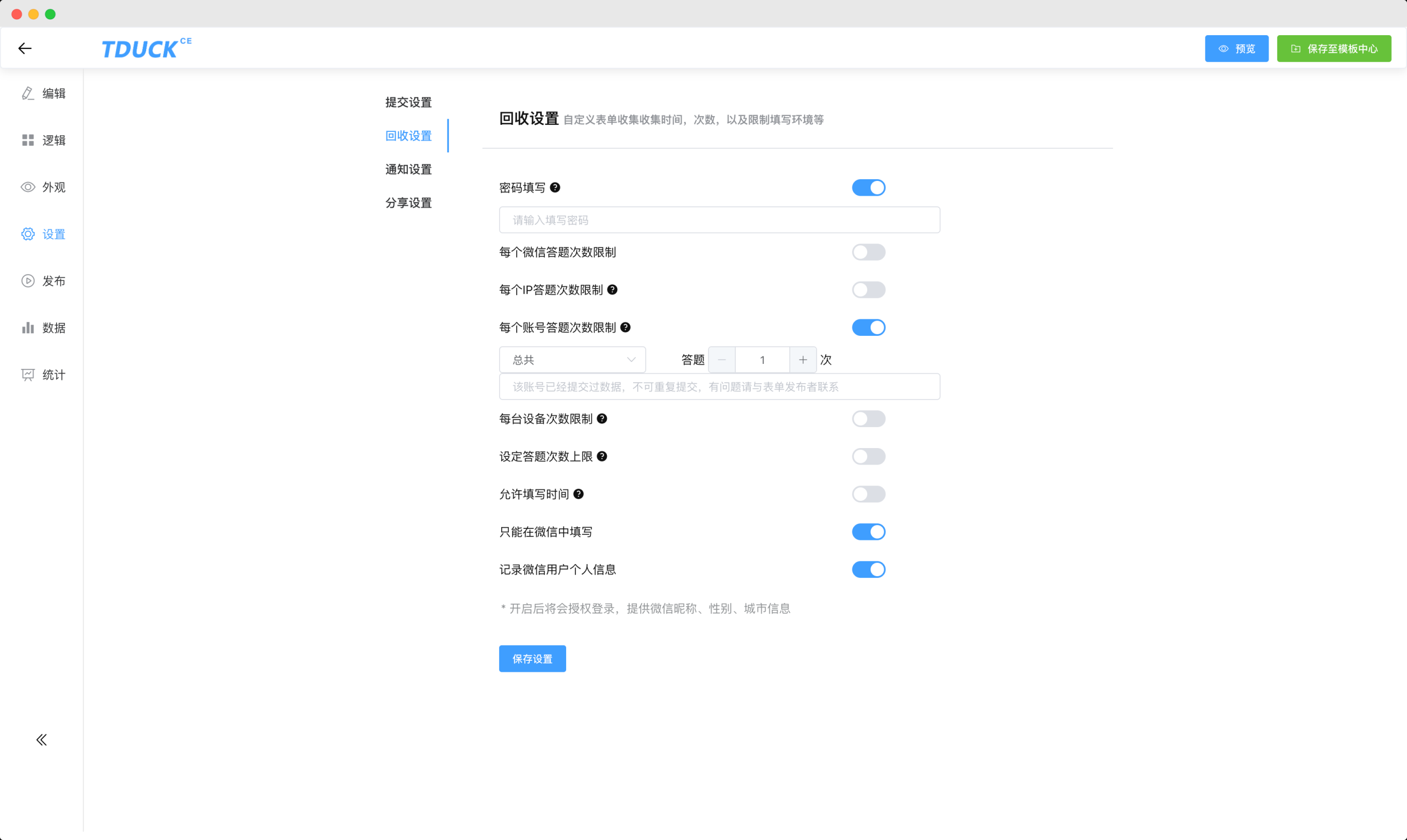 每个微信、账号、ip、设备、答题次数限制、支持设置允许填写时间、记录微信个人信息 。 -