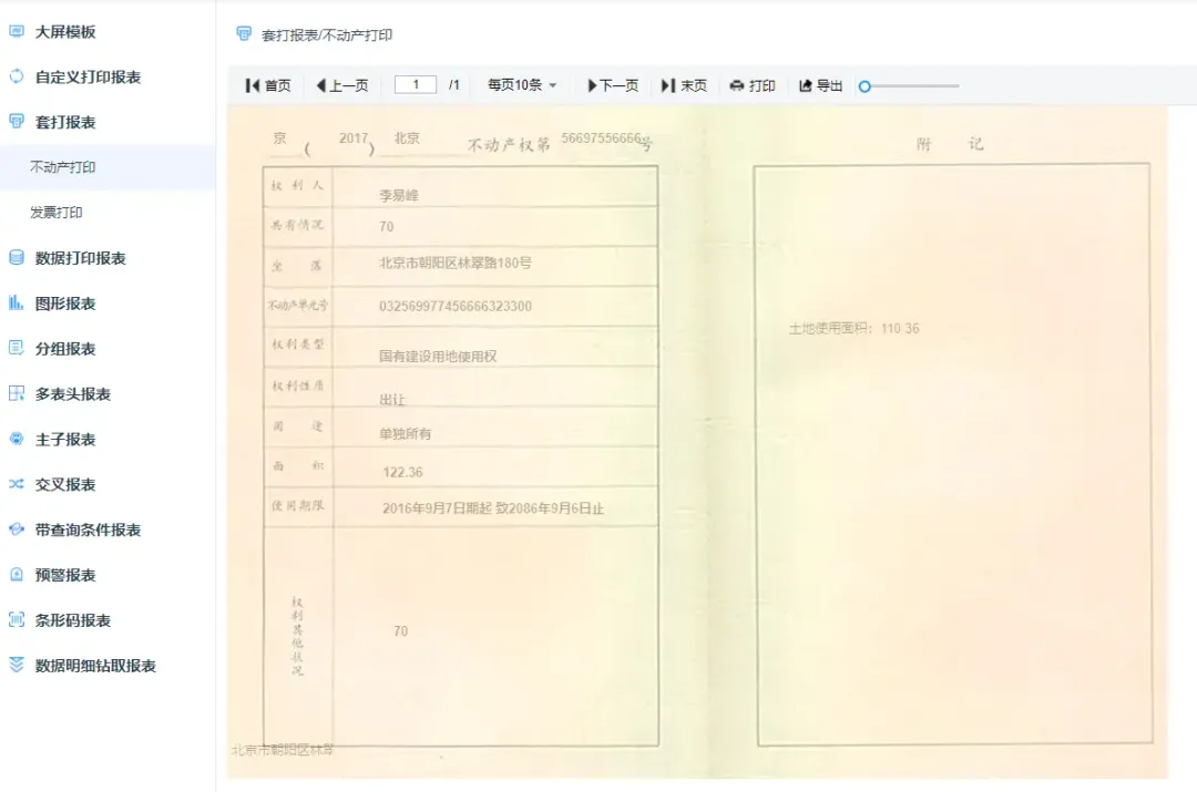 支持打印设计(支持套打、背景打印等)可设置打印边距、方向、页眉页脚等参数 一键快速打印 同时可实现发票套打,不动产证等精准、无缝打印; -