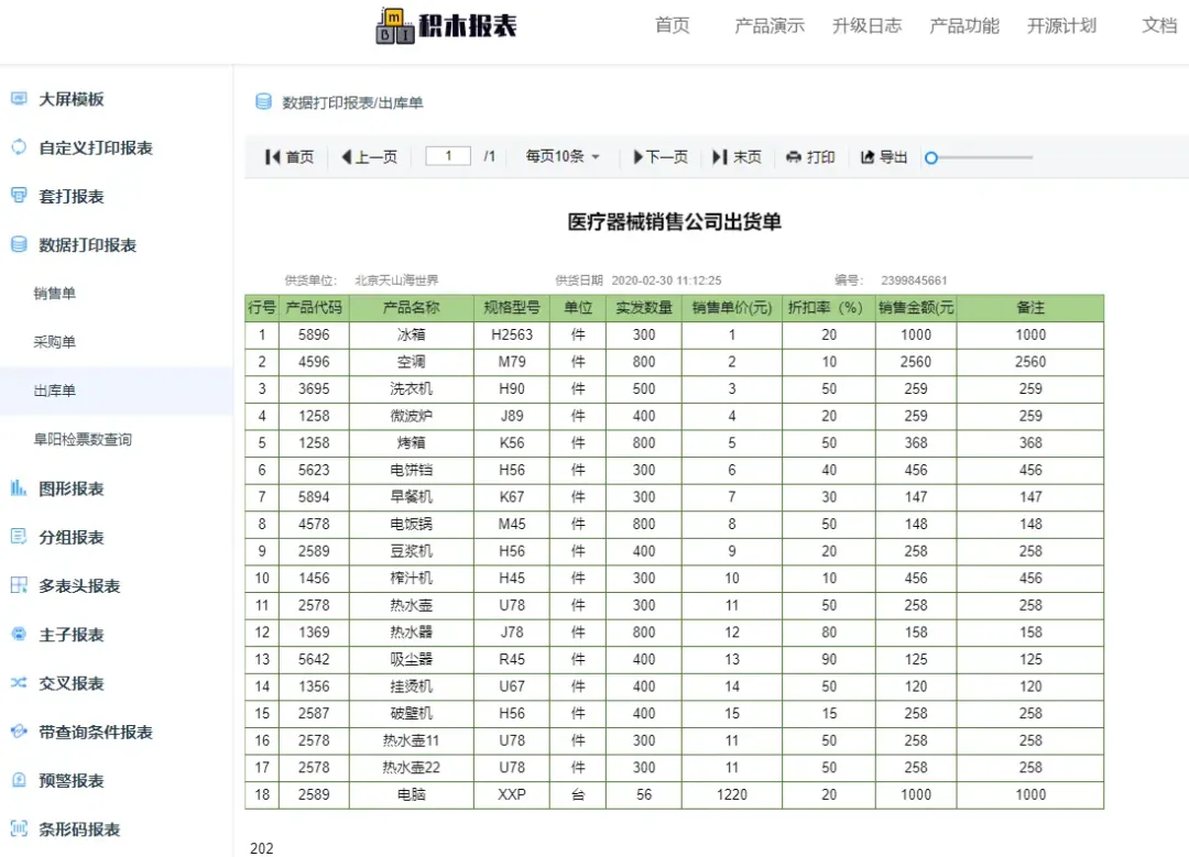 可设计各种类型的单据、大屏,如出入库单、销售单、财务报表、合同、监控大屏、旅游数据大屏等;