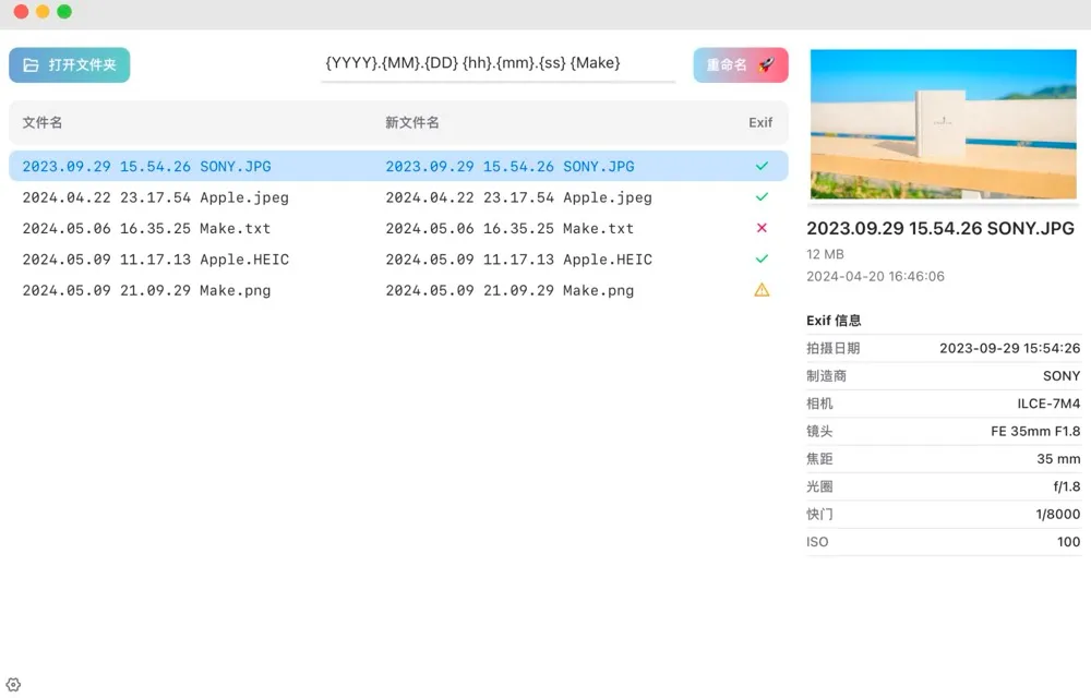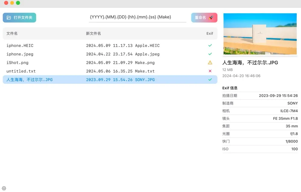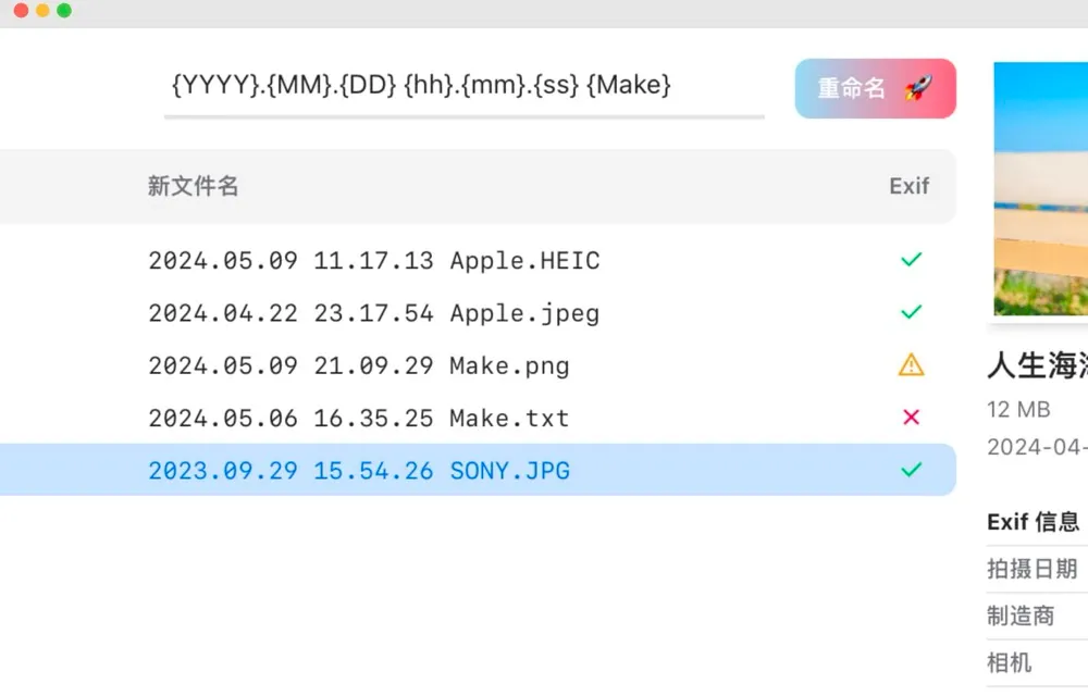 这是一个使用 EXIF 数据给图片重命名的跨平台桌面应用,支持 Windows、MacOS、Linux。