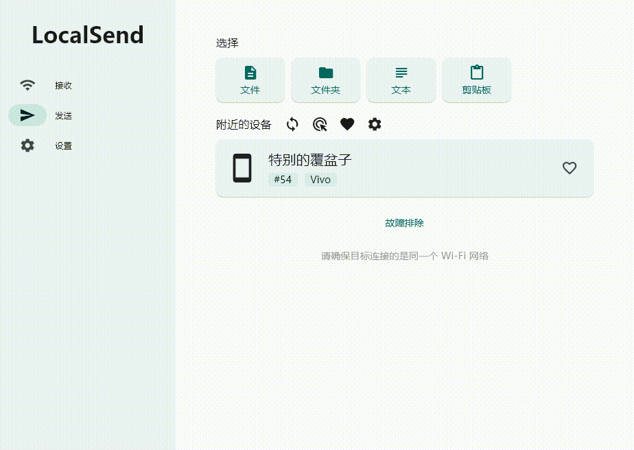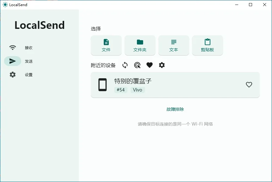 下面是打开后的界面,左边有“接收”、“发送”、“设置”。在“发送”这里,我们可以看到“选择”,这里我们可以选择“文件”、“文件夹”、“文本”、“剪贴板”。下面是“附近的设备”,如果有在网的设备,底下都会显示出来。