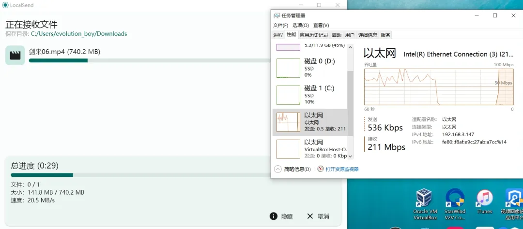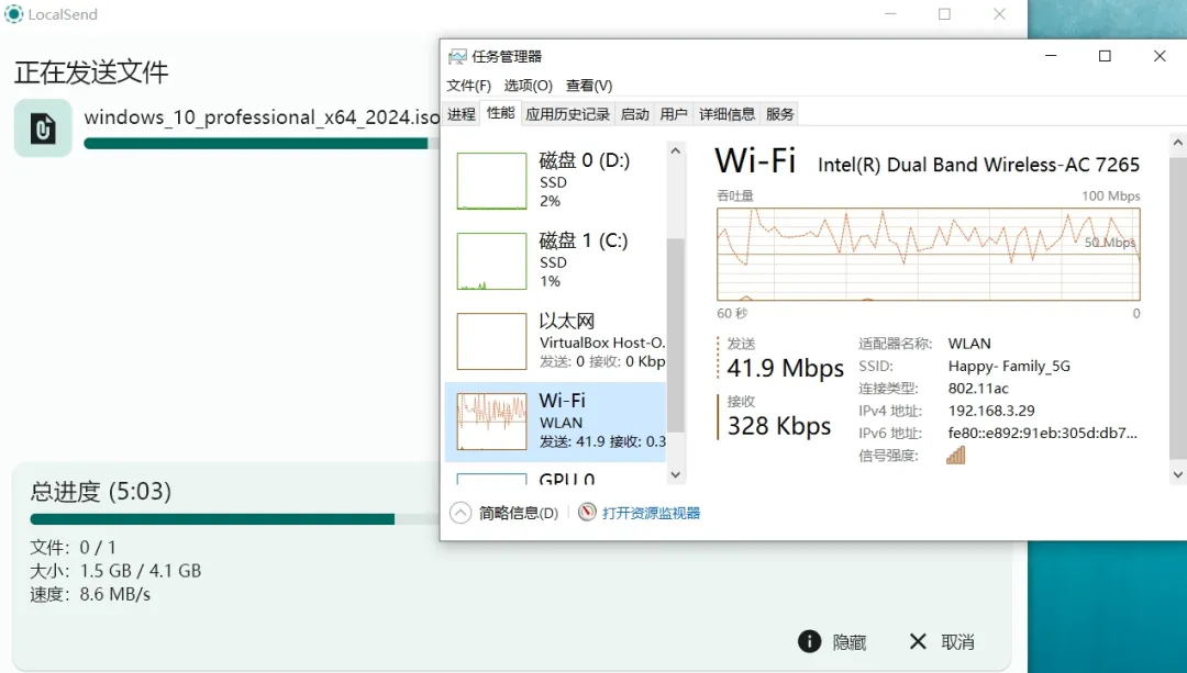 以上就是对LocalSend的一个简单的介绍。上面在贴几张图,是它的一个传输速度的图片。首先说明一下,我用的是一个WIFI5的路由器2.4G,性能相对差一些。