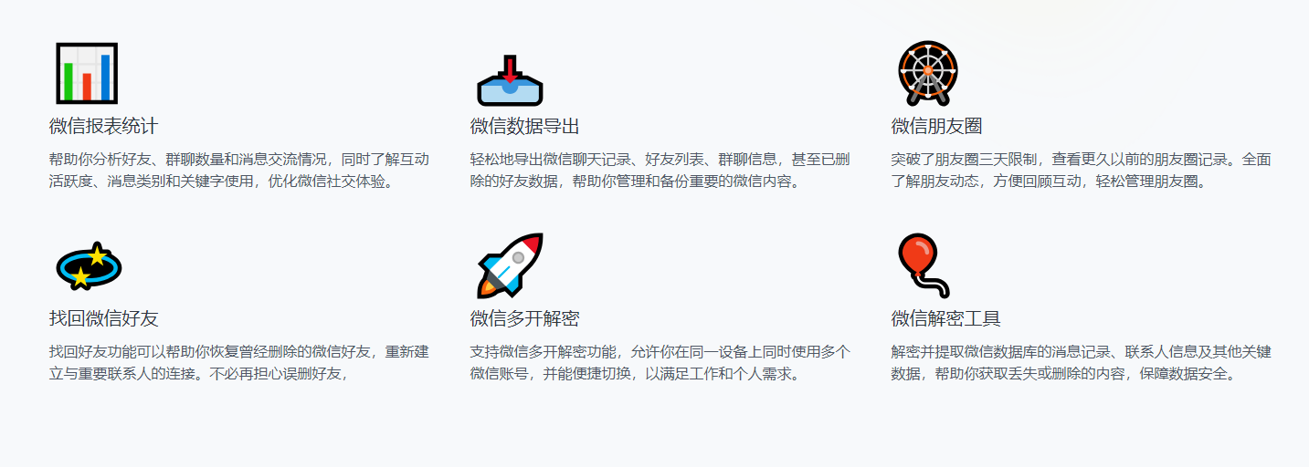 支持导出聊天记录、联系人、群聊信息,及查看超过三天限制的朋友圈历史记录和找回微信好友。