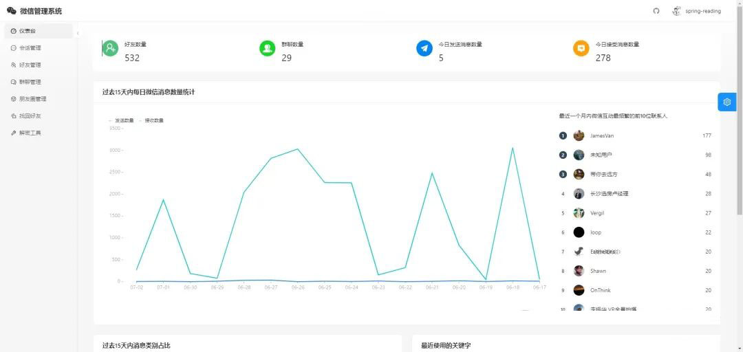 准确显示好友数、群聊数和当日消息总量,提供过去15天每日消息统计,了解社交活跃度。 -