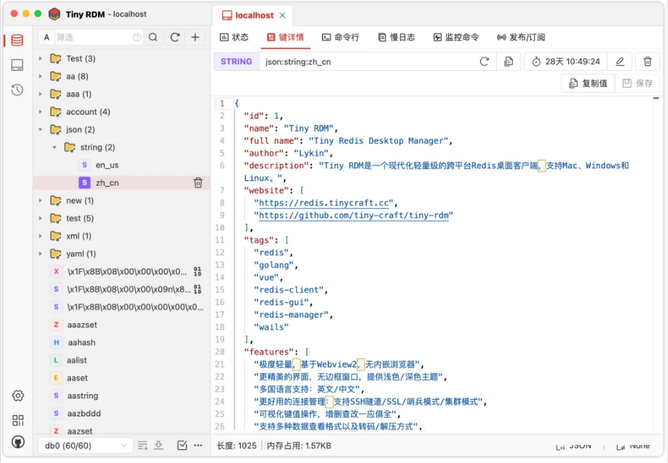 该项目是基于 WebView2 的 Redis 桌面客户端,拥有小巧的体积和精美的界面,同时支持中文。它提供了多种连接方式、分段加载、慢日志、转码显示等功能,可以在 Windows、Linux 和 macOS 系统上使用。
