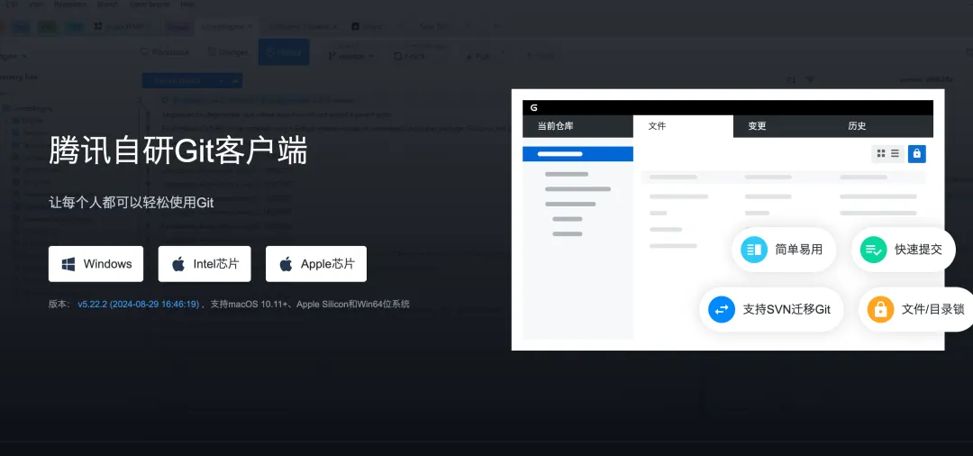 • 极简操作,类似于 SVN 或 P4 的集中式版本控制工具体验,可一键提交或更新