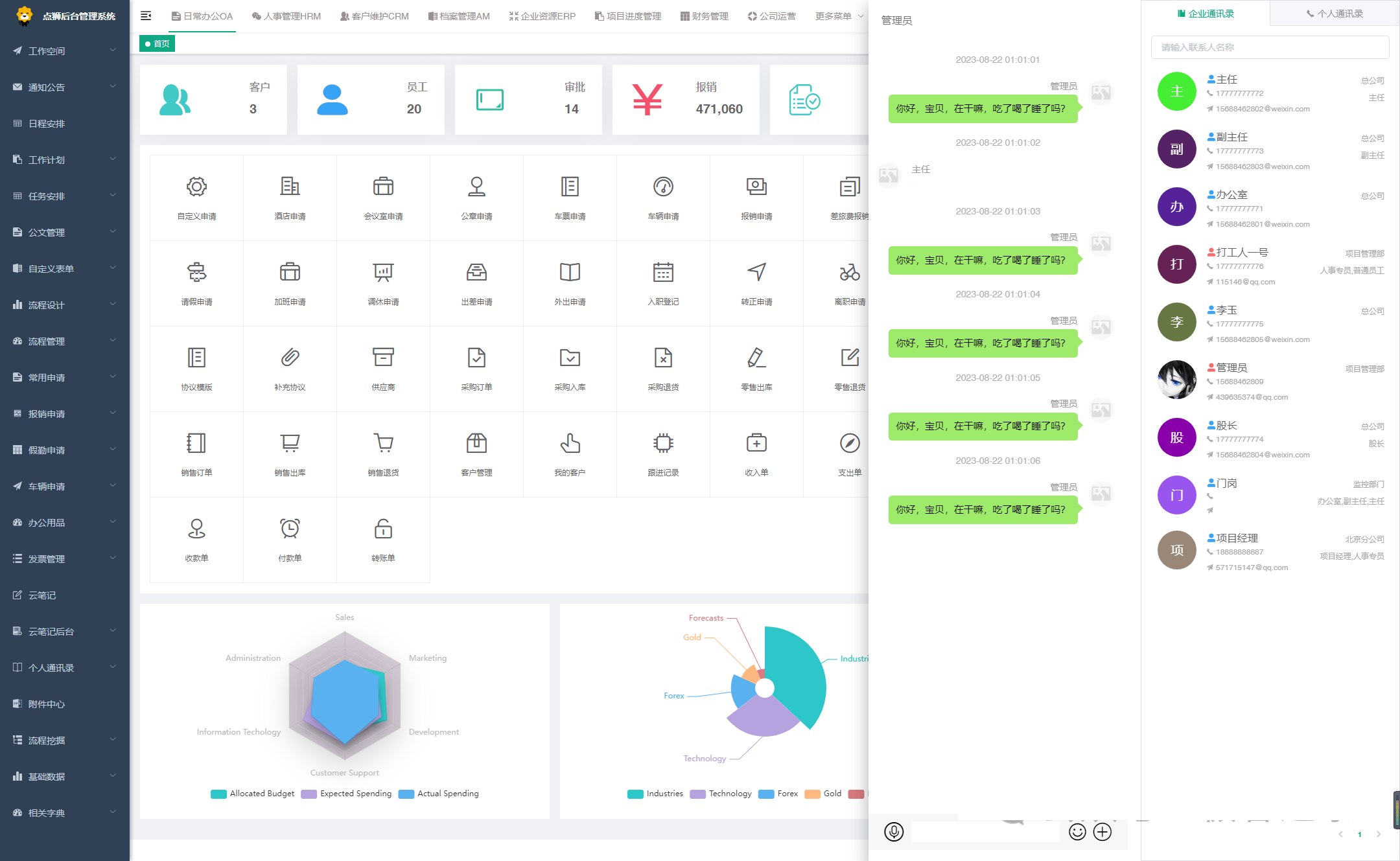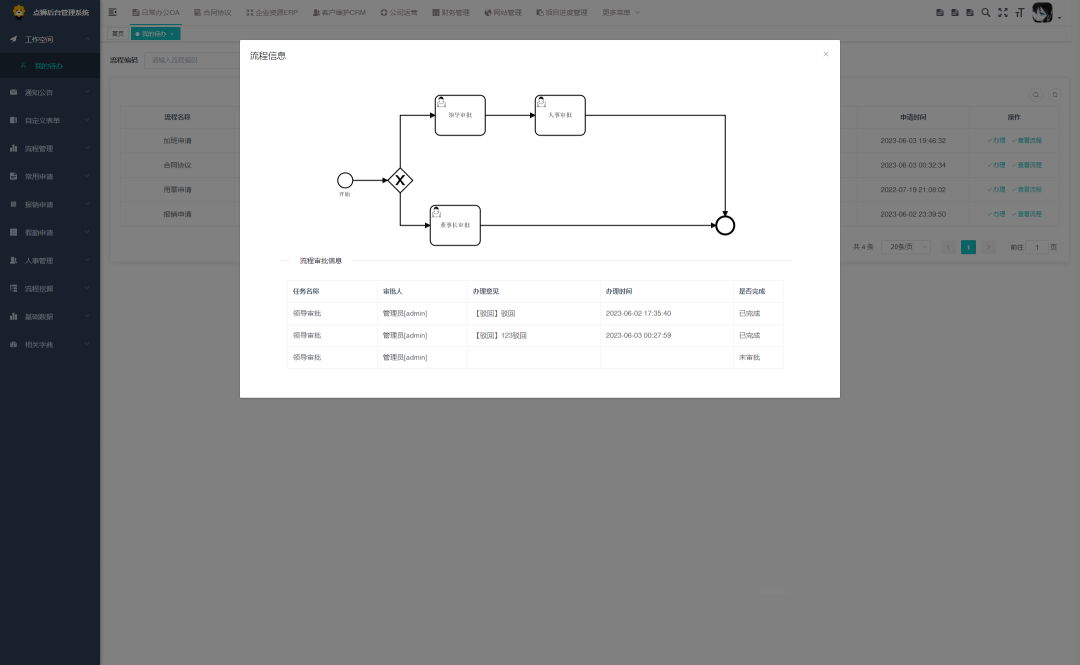 • 系统集成了系统设置、人事管理、行政管理、消息管理、企业公告、知识库、审批流程设置、办公审批、日常办公、财务管理、客户管理、合同管理、项目管理、任务管理等基础模块。