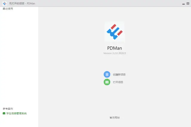 安装后打开 PDMan ,它默认提供一个案例,就是左下角这个 学生信息管理系统。