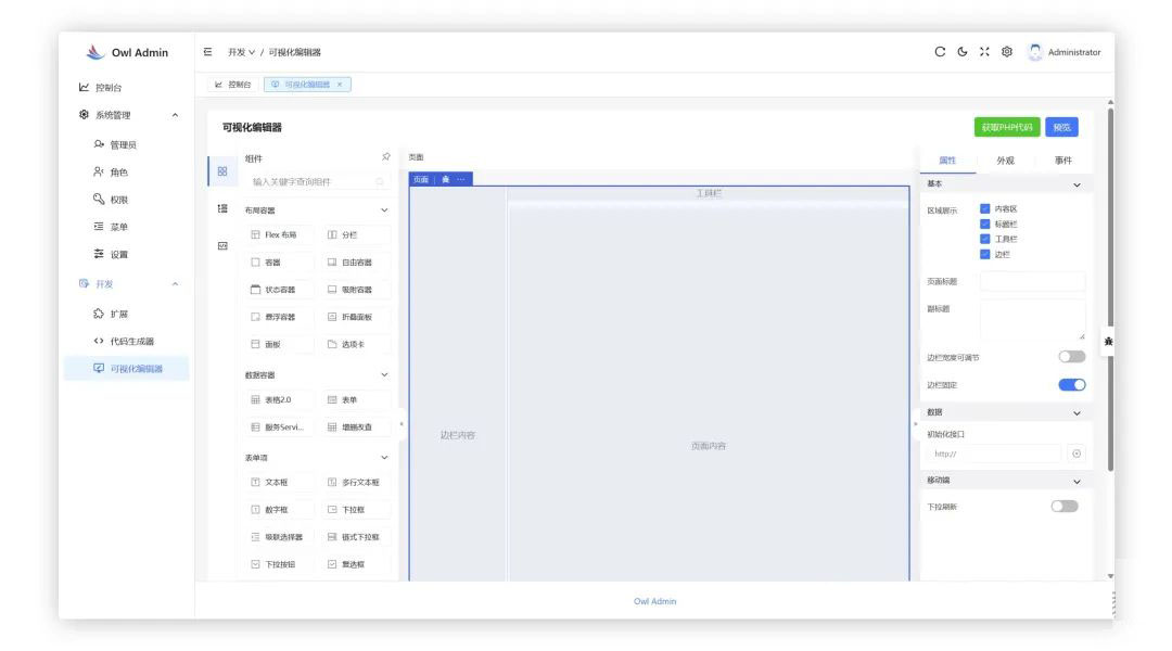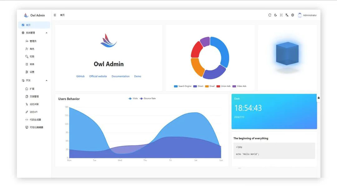 Owl Admin是基于 laravel 和 amis 开发的后台框架,友好的组件使用体验,可轻松实现复杂页面,内置代码生成器,低学习成本,让开发者快速搭建后台管理系统。