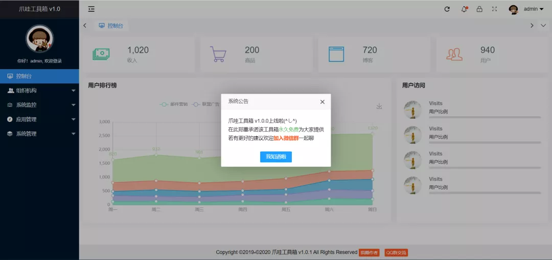 一个基于SpringBoot、JPA、Shiro的后台管理系统,单体架构,依赖少,极易上手,后端开发的福利。最重要的是还附带免费小程序以及微服务版本,可自行选择。