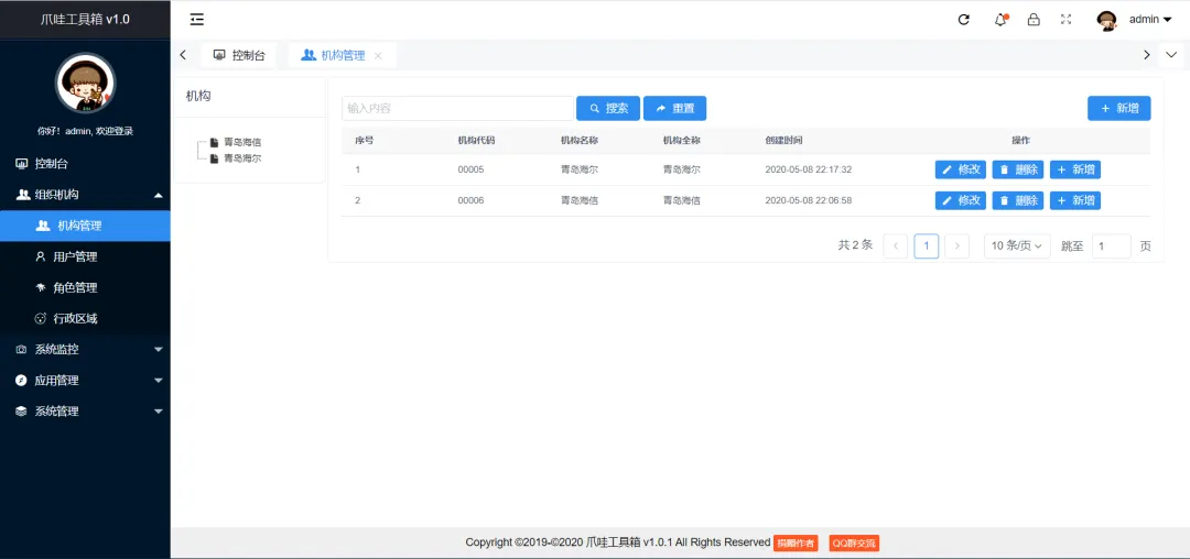 • 组织机构:机构管理、用户管理、角色管理、行政区域。
