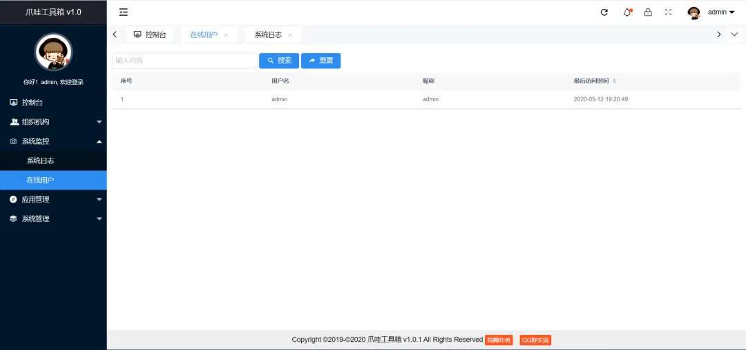 • 系统监控:系统日志、在线用户,后期会慢慢追加完善。