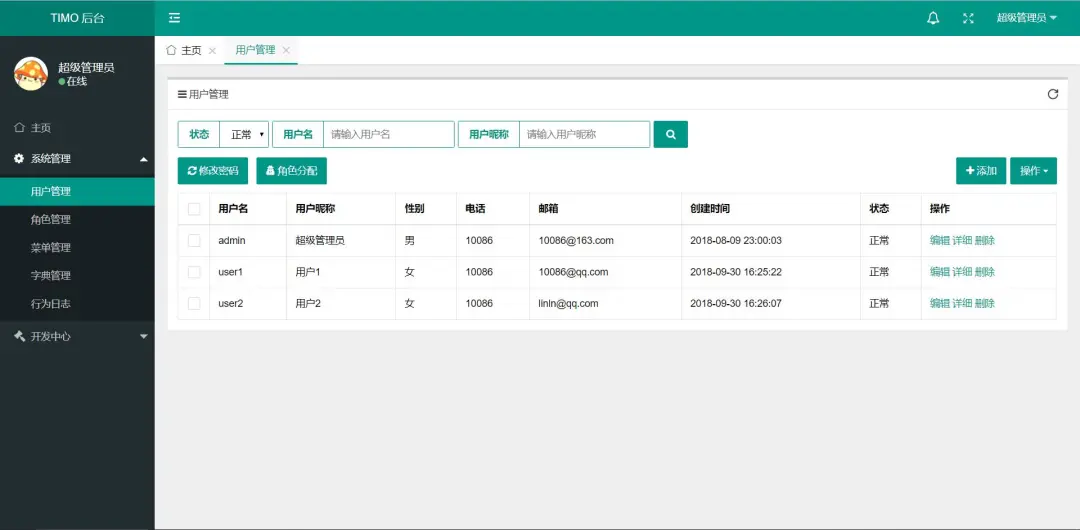 TIMO后台管理系统,基于SpringBoot2.0 + Spring Data Jpa + Thymeleaf + Shiro 开发的后台管理系统,采用分模块的方式便于开发和维护,支持前后台模块分别部署,目前支持的功能有:权限管理、部门管理、字典管理、日志记录、文件上传、代码生成等,为快速开发后台系统而生的脚手架!