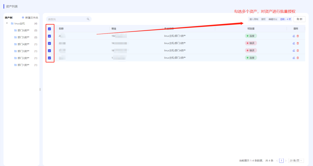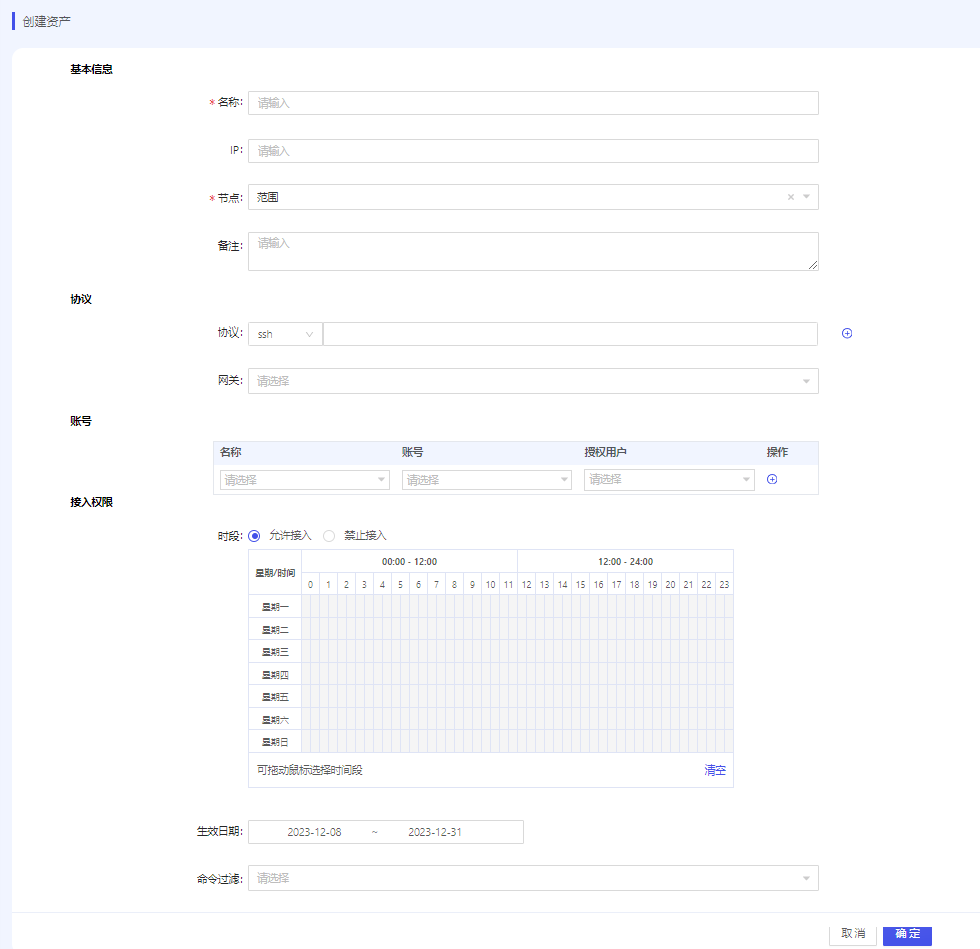 对资产的授权控制主要通过账号授权和接入限制来指定用户能使用哪个资产账号来访问哪些资产以及拥有什么样的接入限制