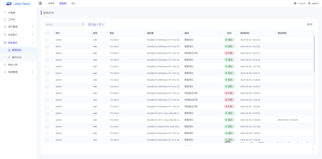 登录日志记录了所有用户在OneTerm平台的用户登录日志,包括网页端和客户端的登录详情信息,在此页面可以查看用户登录类型、登录地址、登录浏览器、登录状态和描述、登录时间和登出时间等信息。