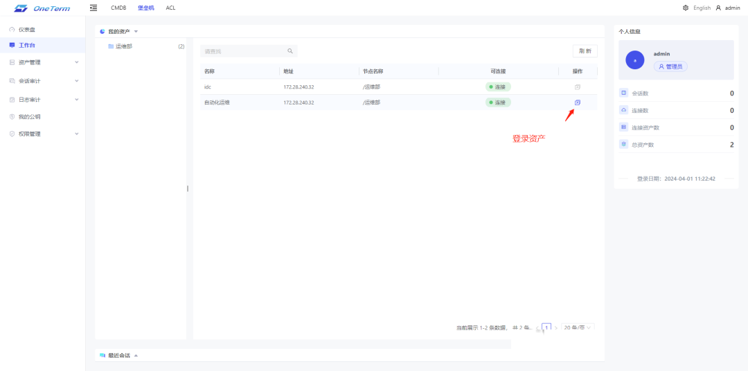 个人信息简述,可以查看当前用户的在线会话数、连接数、连接资产数以及总资产数和上次登录日期等信息