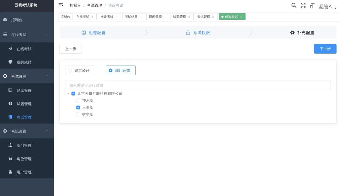管理端:题库管理、试题管理、考试管理、用户部门管理、查看考试情况等等。