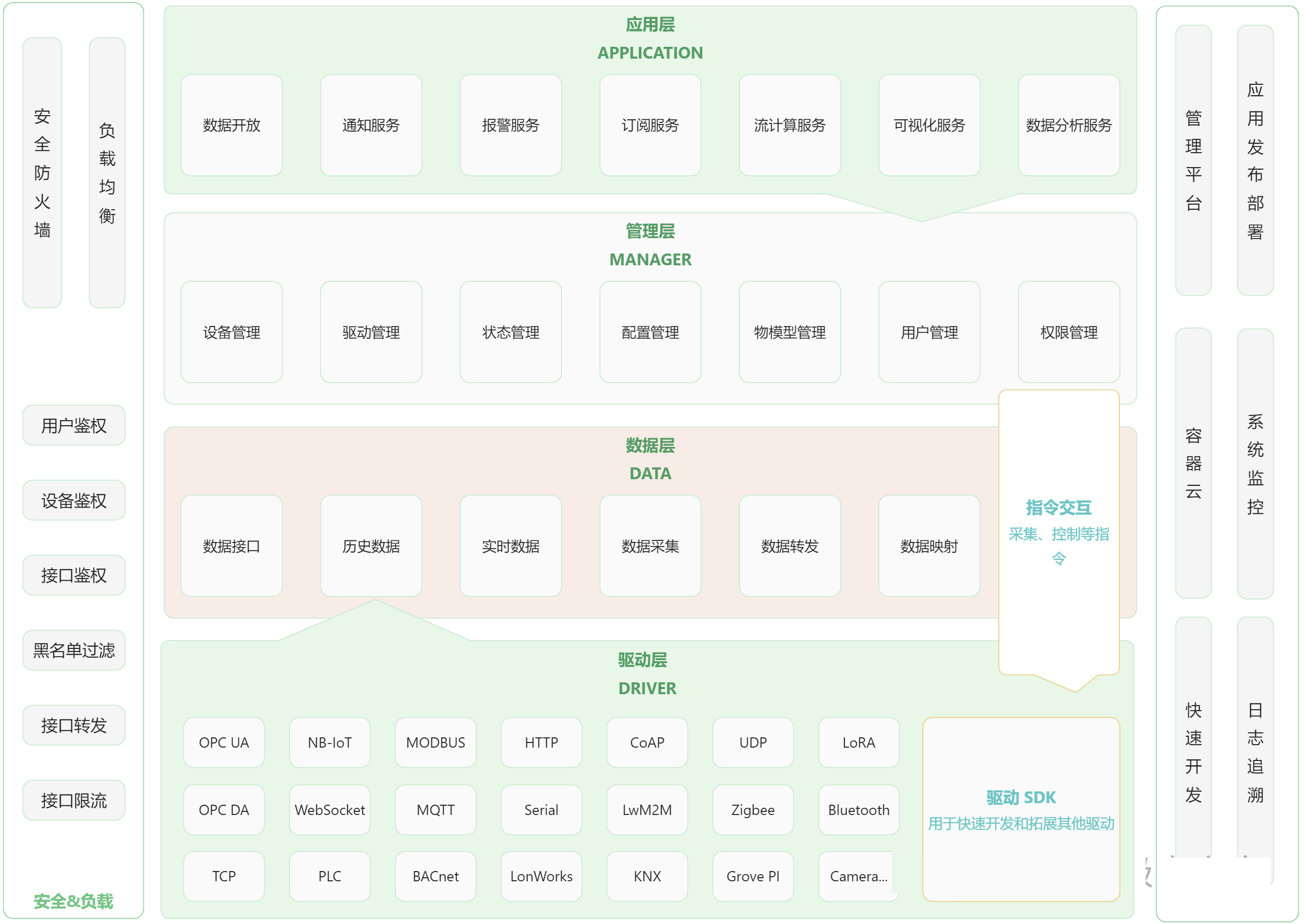 • 驱动层: 用于提供标准或者私有协议连接物理设备的 SDK,负责南向设备的数据采集和指令控制,基于 SDK 可实现驱动的快速开发