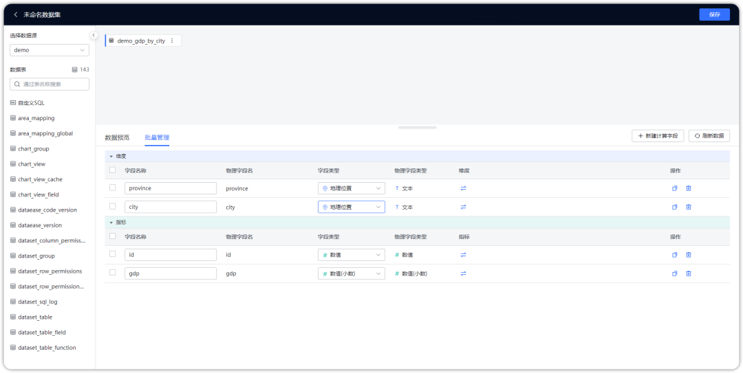 在数据准备模块,切换到数据集菜单,在【官方示例】分组下添加数据库数据集,选择上一步创建的数据源 “demo”,勾选数据表 “demo_gdp_by_city” 点击确认即可。