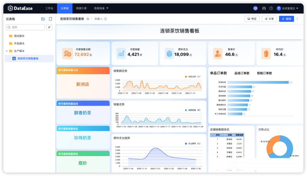 DataEase 是数据可视化分析工具( BI 工具 ),帮助用户快速分析数据并洞察业务趋势,从而实现业务的改进与优化。DataEase 支持丰富的数据源连接,能够通过拖拉拽方式快速制作图表