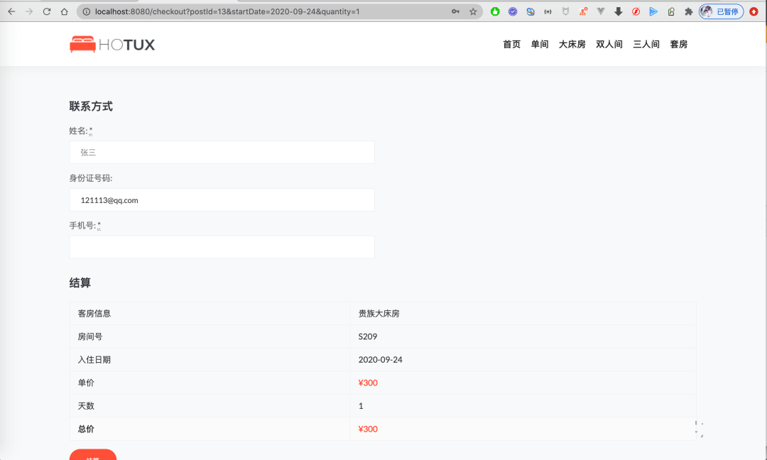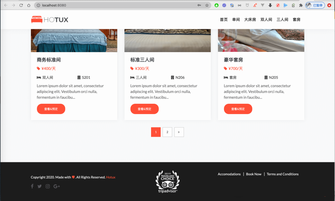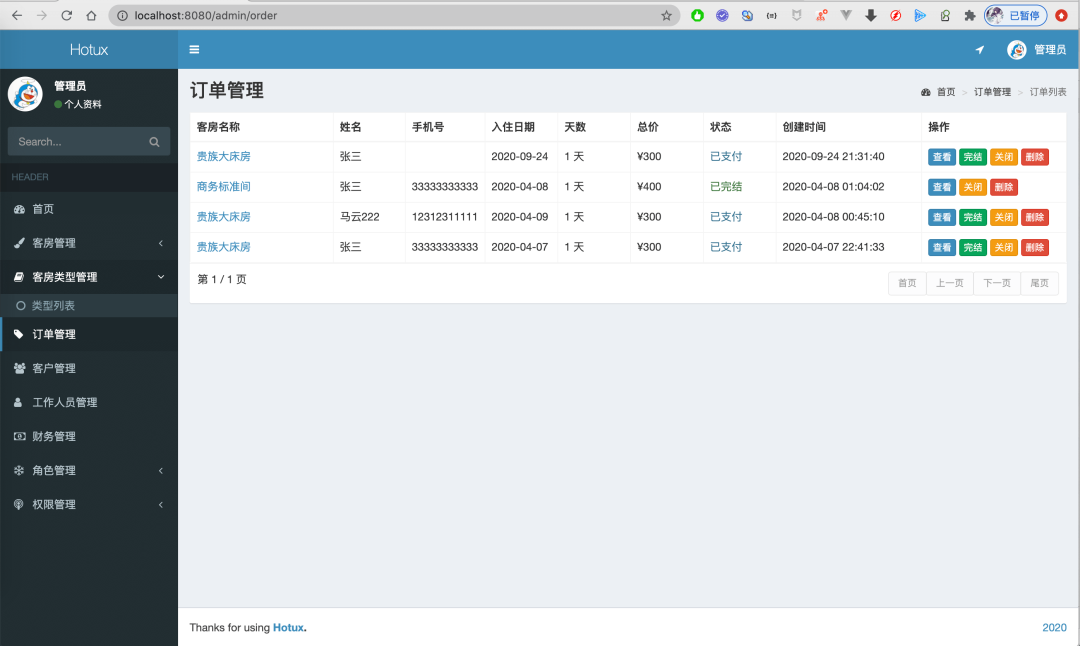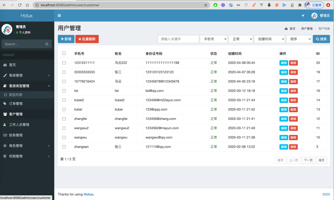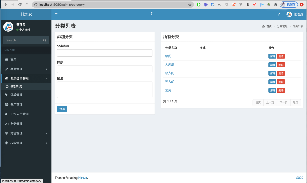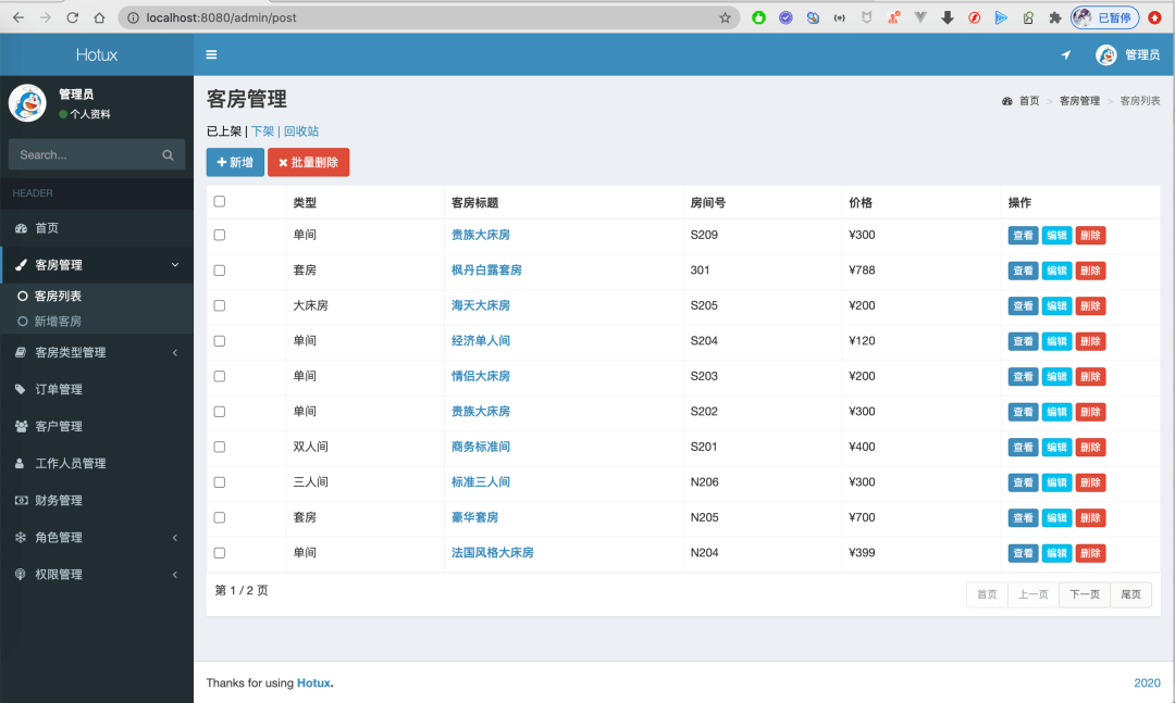 管理员功能: 客房管理、客房类型管理、酒店工作人员管理、其他所有权限 -