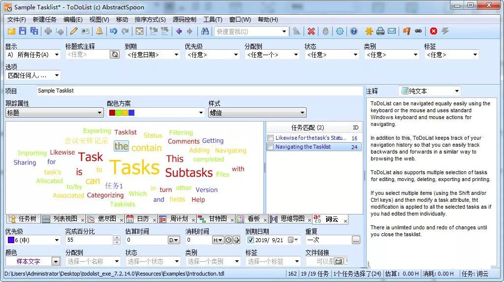 词云主要是展现你的任务列表中的关键词汇总,并且将出现频率最高的词最大化,以此类推。