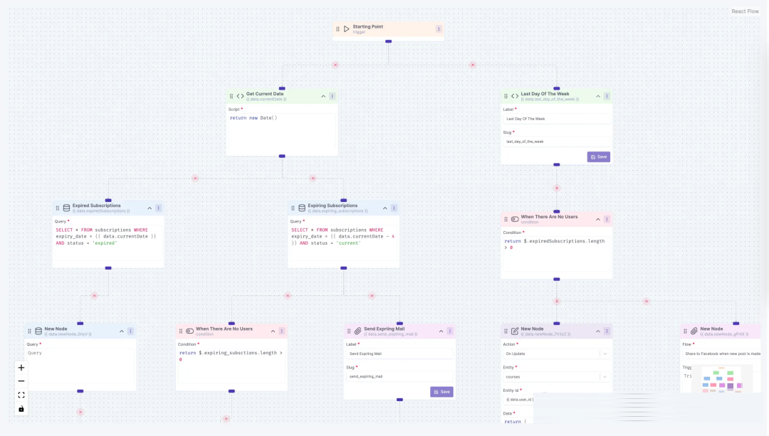 使用我们的无代码工作流构建器来运行您的自定义业务逻辑,例如发送电子邮件和通知、与第三方 API 集成等。