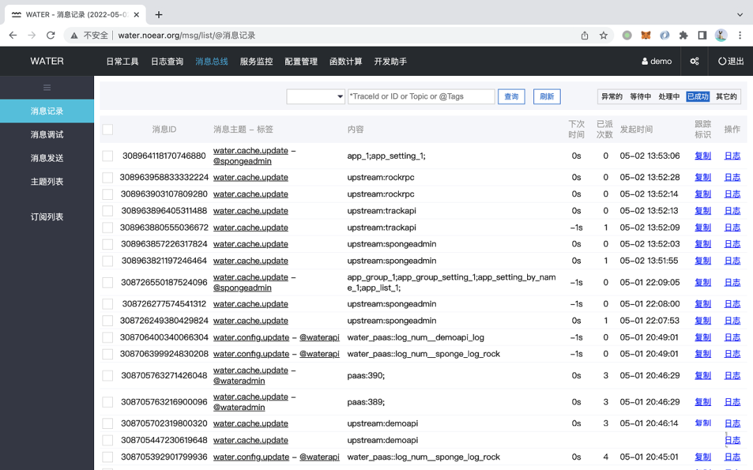 CloudClient.event().publish(new Event("demo.test", "{\"order_id\":1}")); //(非注解模式)