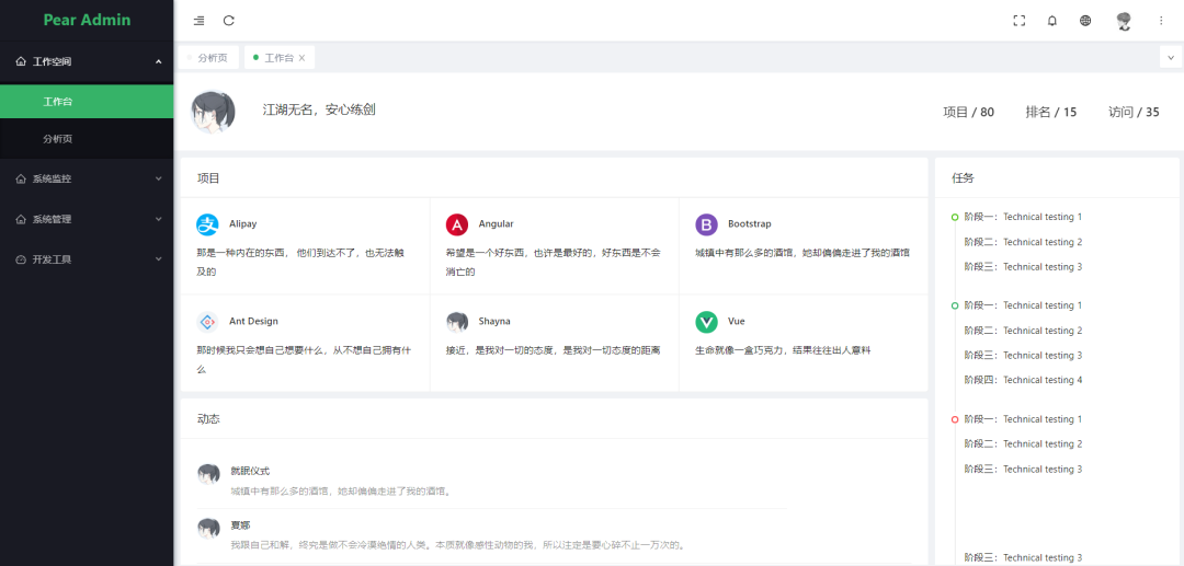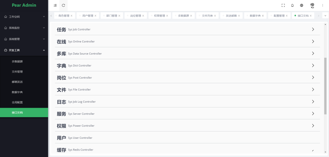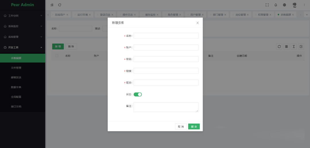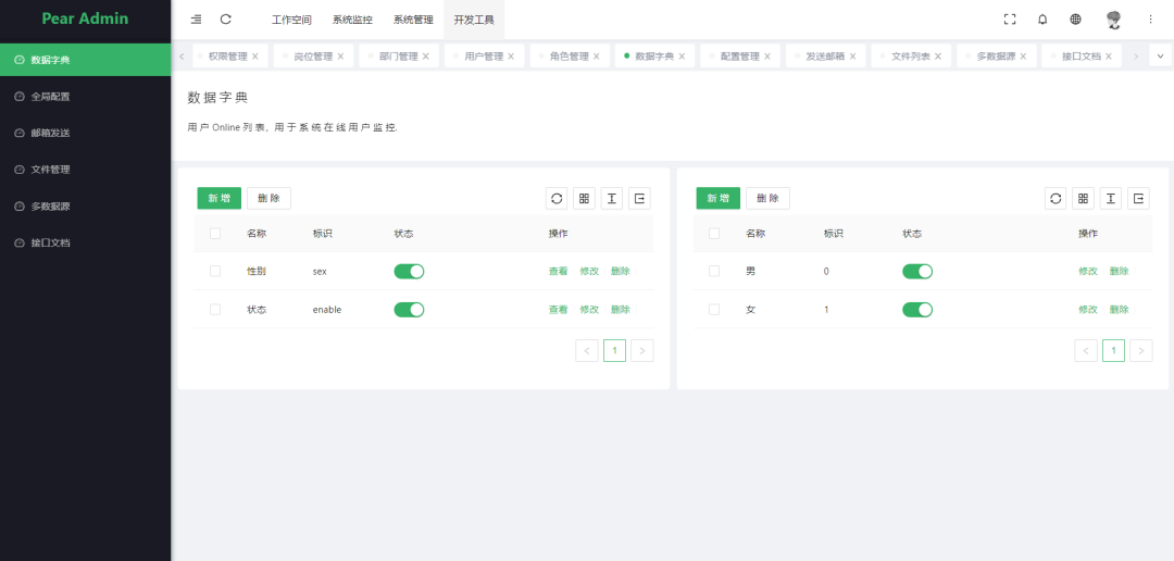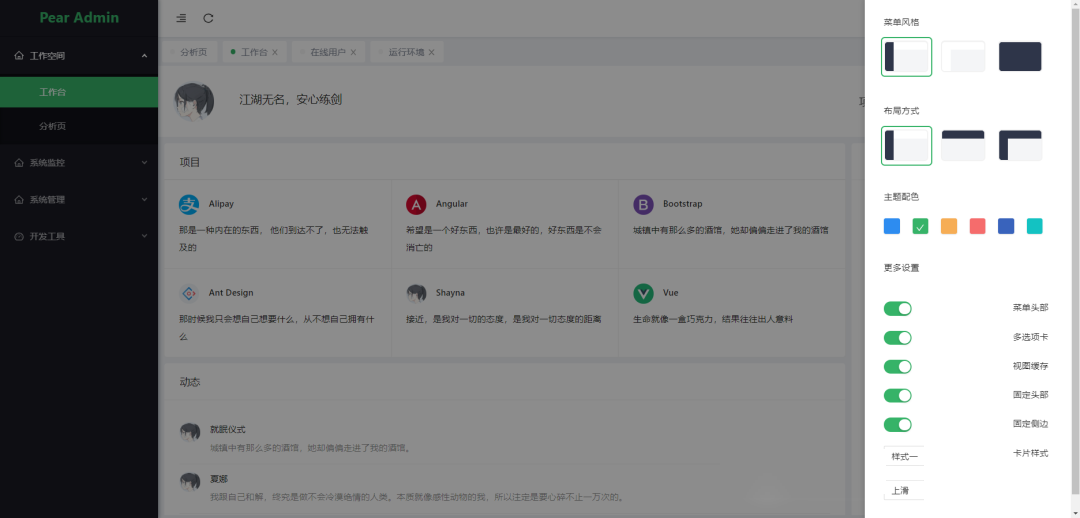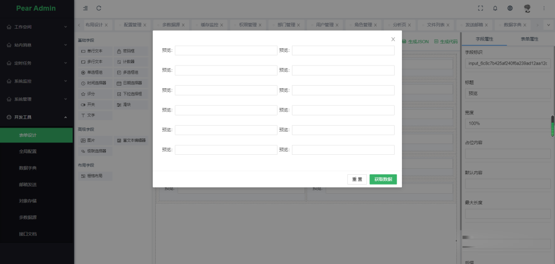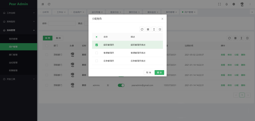 核心模块包括:用户、角色、职位、组织机构、菜单、字典、日志、多应用管理、文件管理、定时任务等功能。